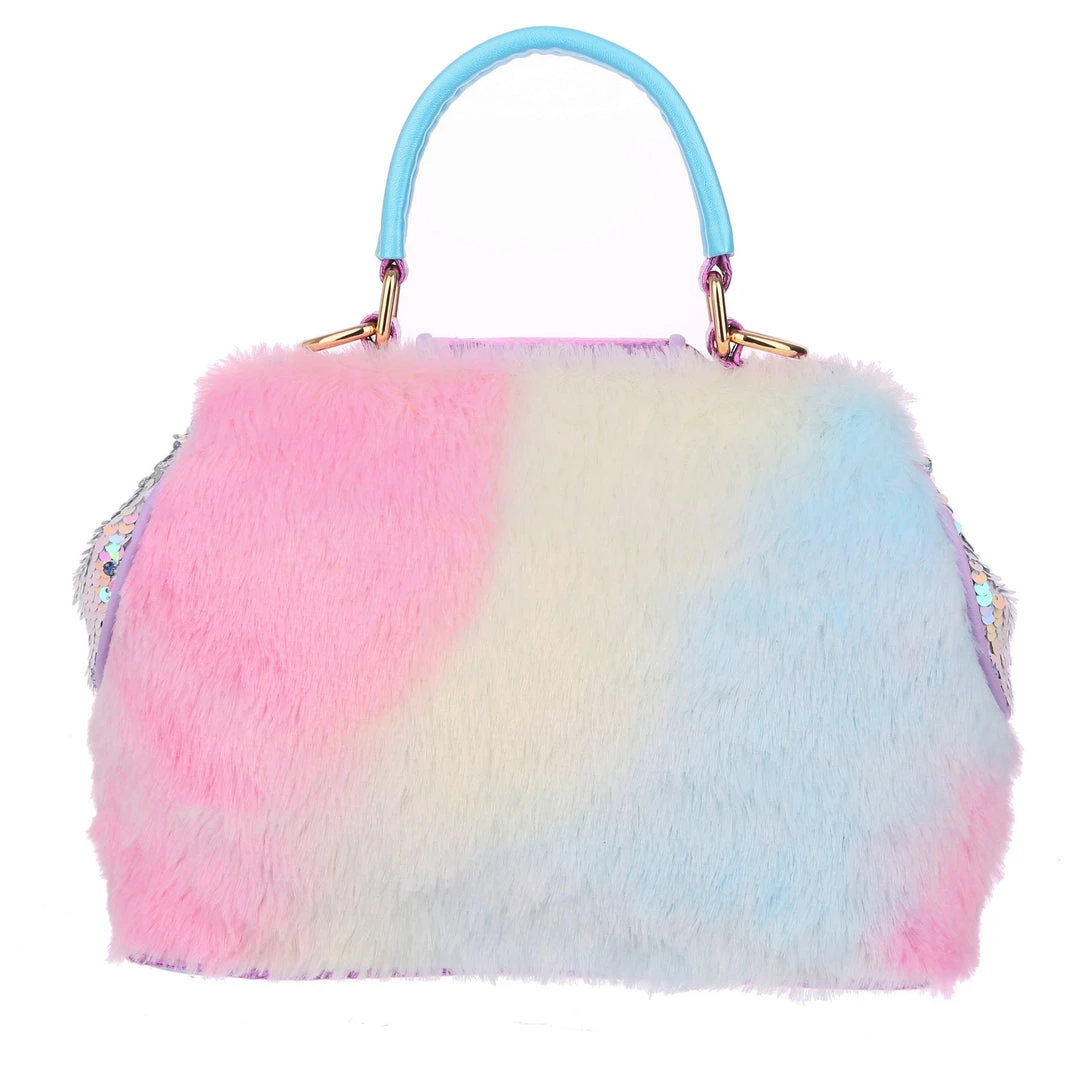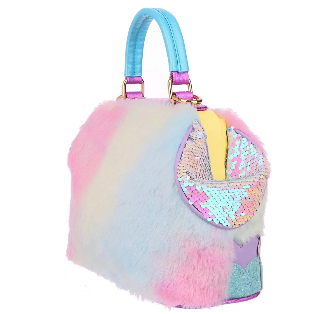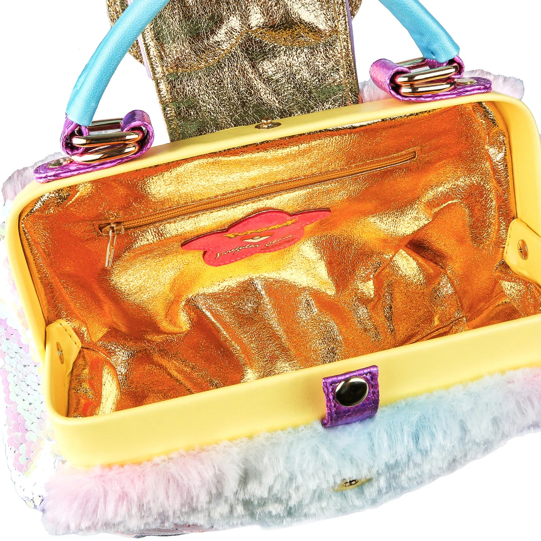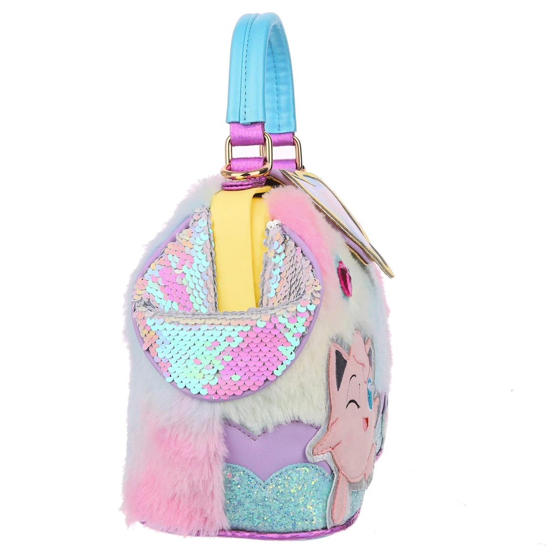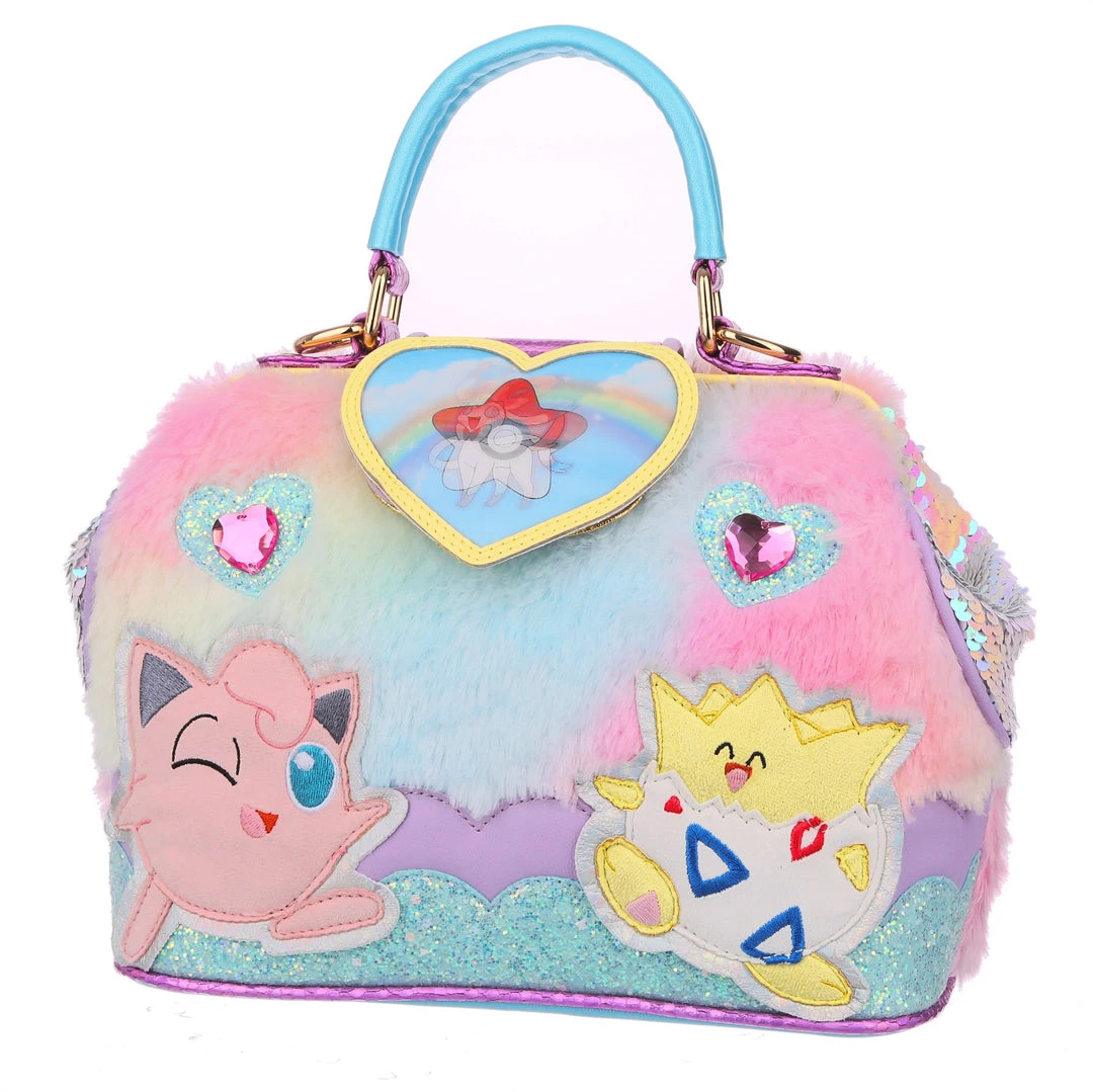 Give yourself a little fairy magic with this darling handbag! A fabulous pastel ombre faux fur is topped with matching scalloped panelling along the bottom and the fabulous Jigglypuff and Togepi are in pride of place on the front. The magnetic fastening features a stunning lenticular image of a star shaped Poké Ball, which shifts to the cutest Sylveon ever! Complete with a top handle, as well as a detachable removable shoulder strap, this bag is sure to give you a little boost whenever you wear it! Featuring Jigglypuff, Togepi, & Sylveon.