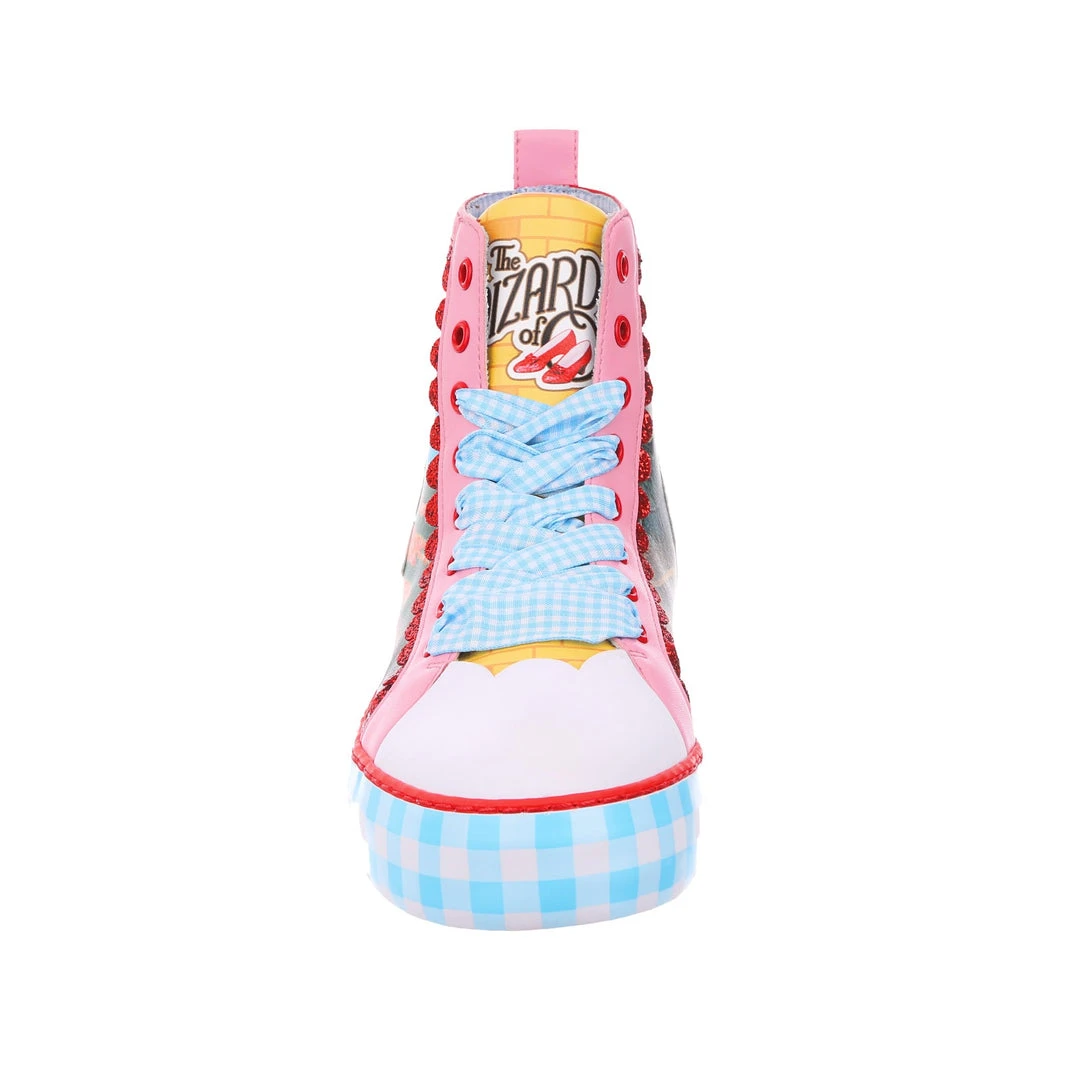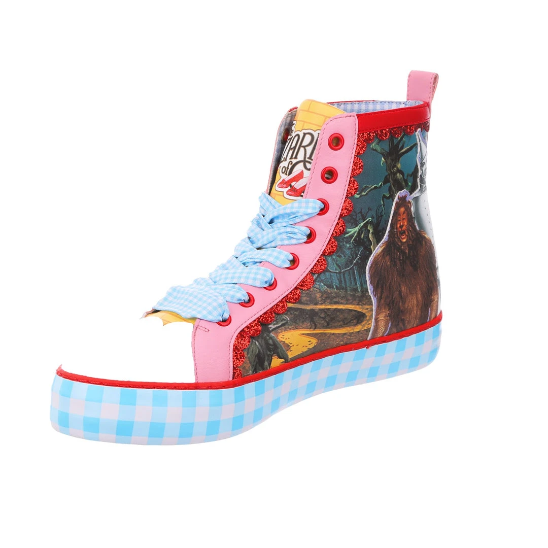 Get practicing your skip, these lace up beauties are sure to take you on all the adventures! Featuring imagery of Dorothy™, Toto™, The Scarecrow™, The Tin Man™ and The Cowardly Lion™, against a stunning landscape from the movie, these high tops are the perfect party piece. A chunky sole is decked out in blue gingham print, which matches the fabulous ribbon laces! So lace them up and get skipping!