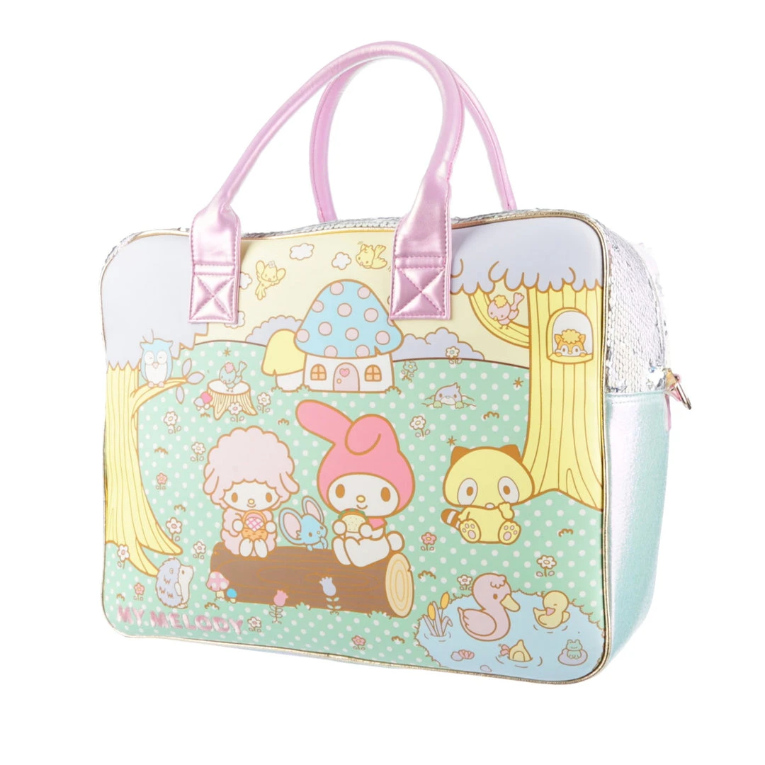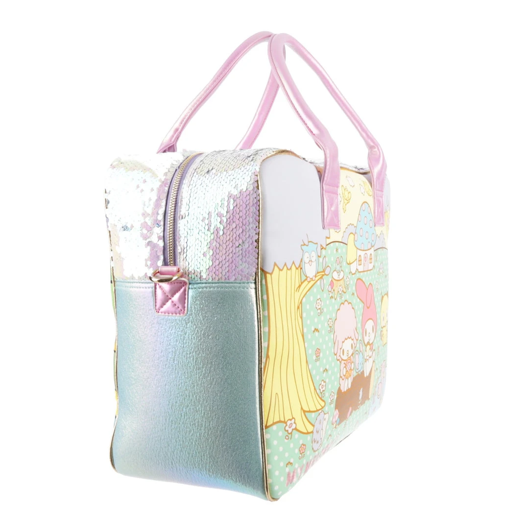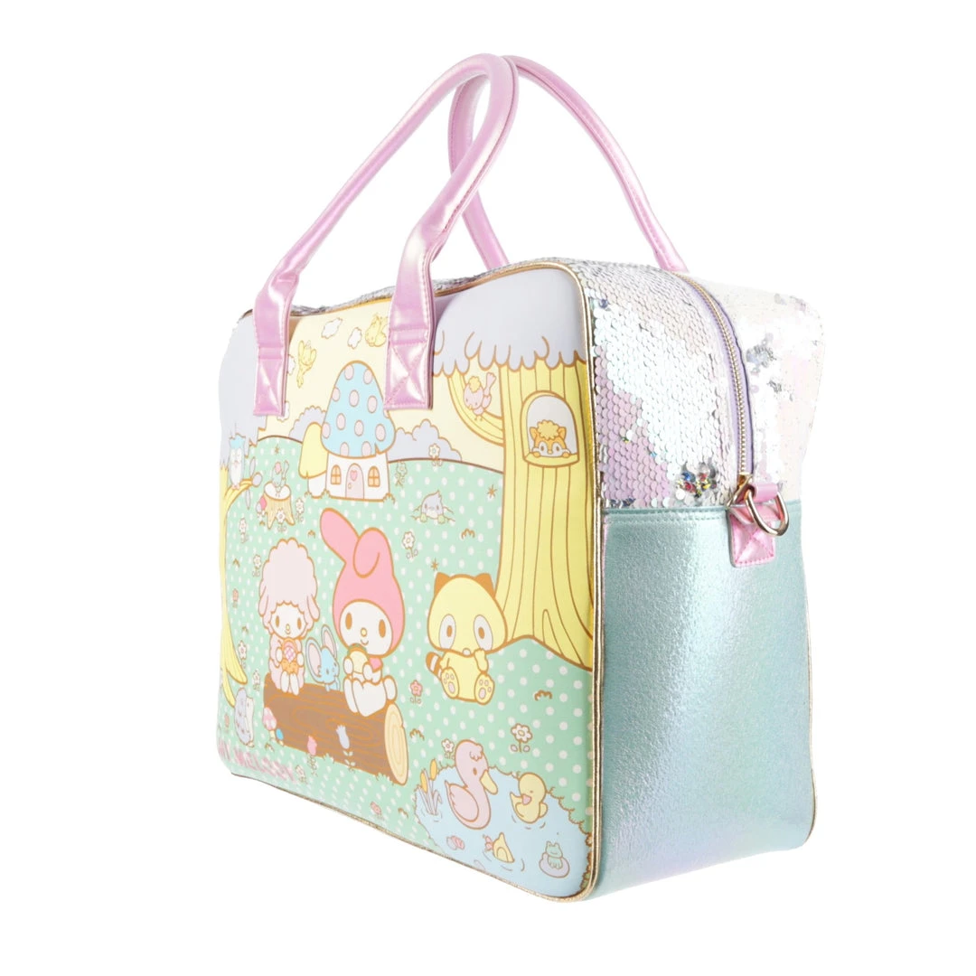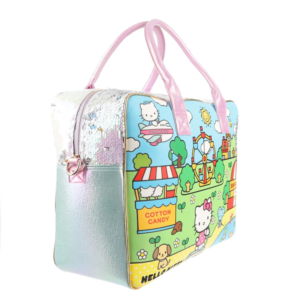 Ready to go on an adventure? This roomy travel bag has all the Hello Kitty cute you need! Featuring a bright fairground scene on one side and a pastel magical scene on the other, all pulled together with reversible sequin panelling on the side and pink carry handles! A detachable shoulder strap makes this style hands-free, meaning you don’t have to sacrifice your kawaii looks whilst on the go!