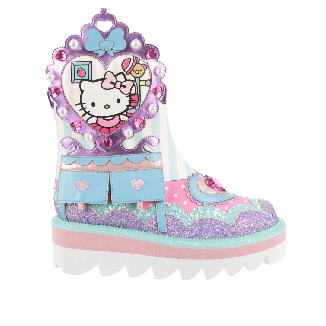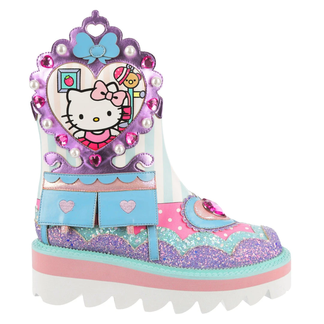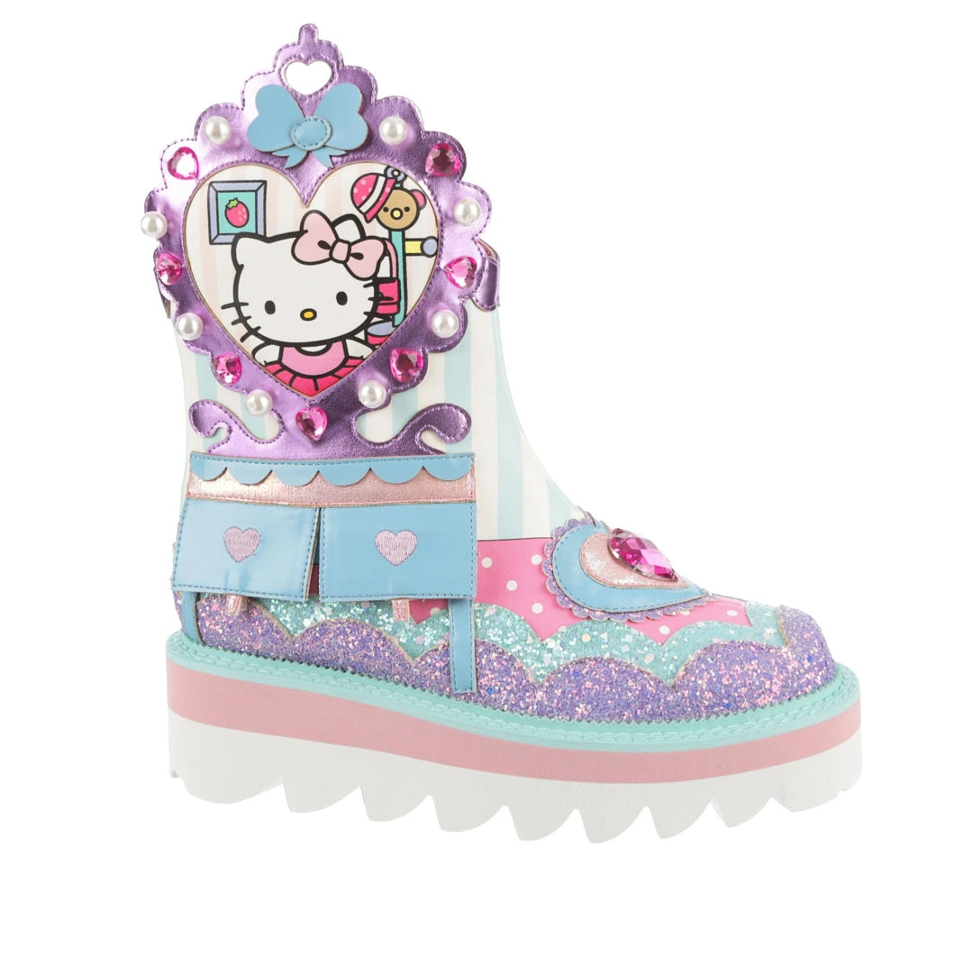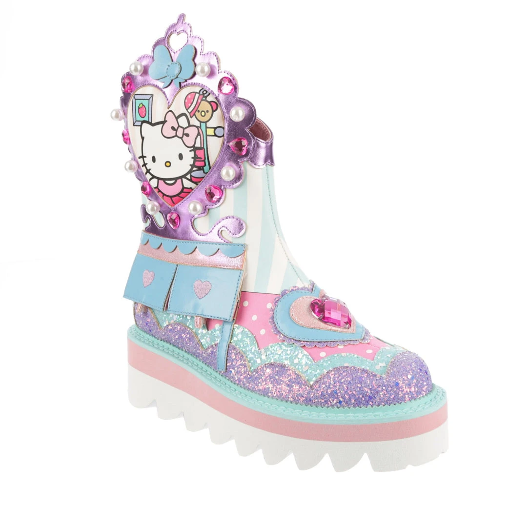 Getting ready can be so much fun, especially with a friend! These adorable boots feature Hello Kitty and My Melody in heart-shaped mirrors, surrounded by stunning pearls and gems! Open up the drawers underneath to see a cute surprise! Swathed in pastel colours and metallic textures – these statement boots aren’t to be missed!