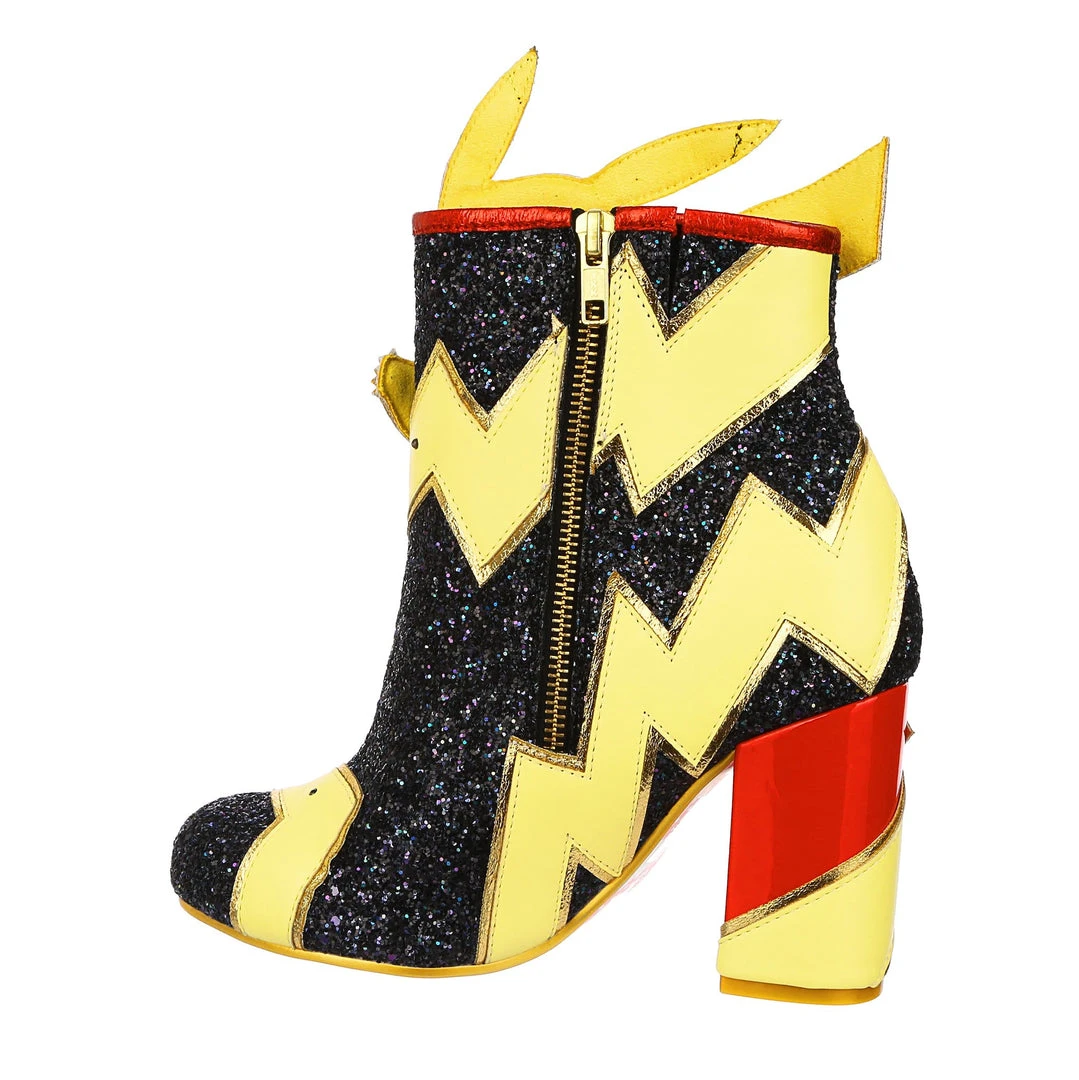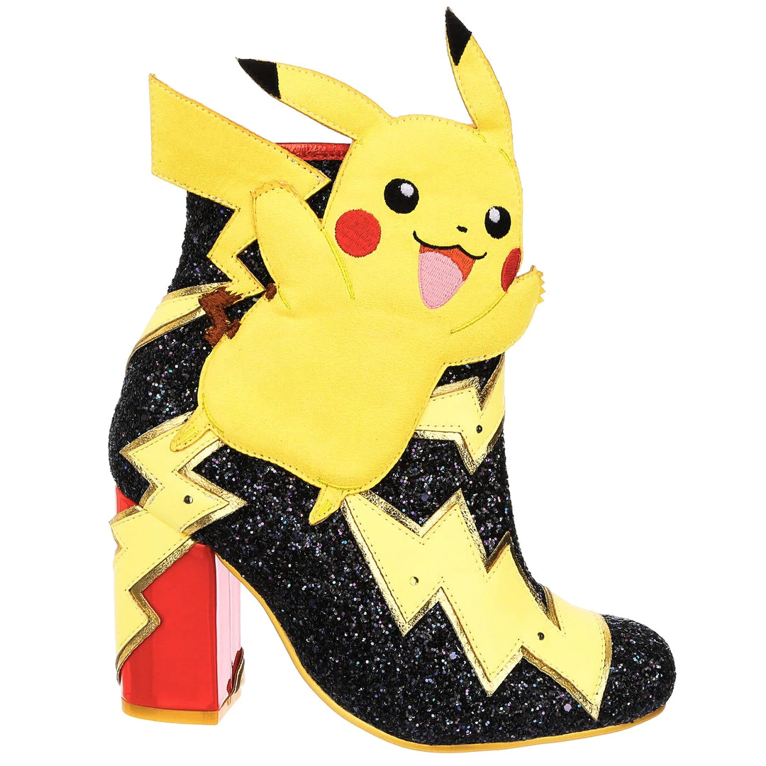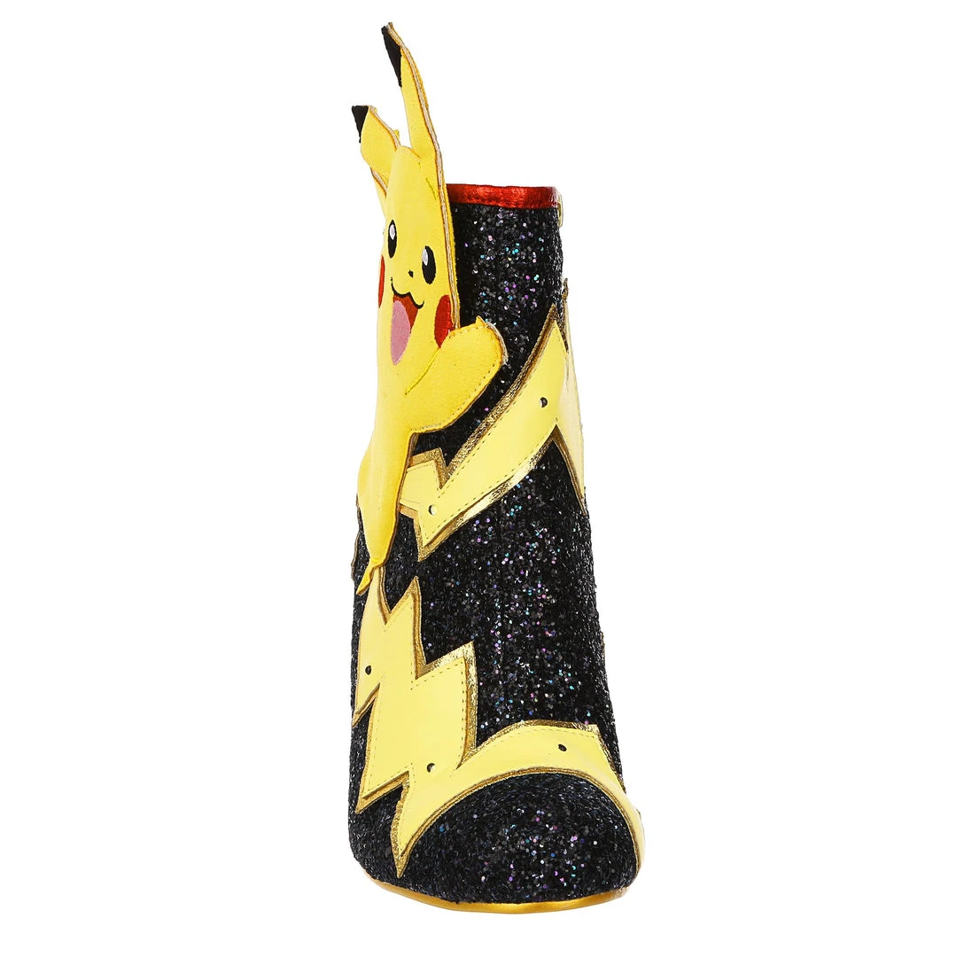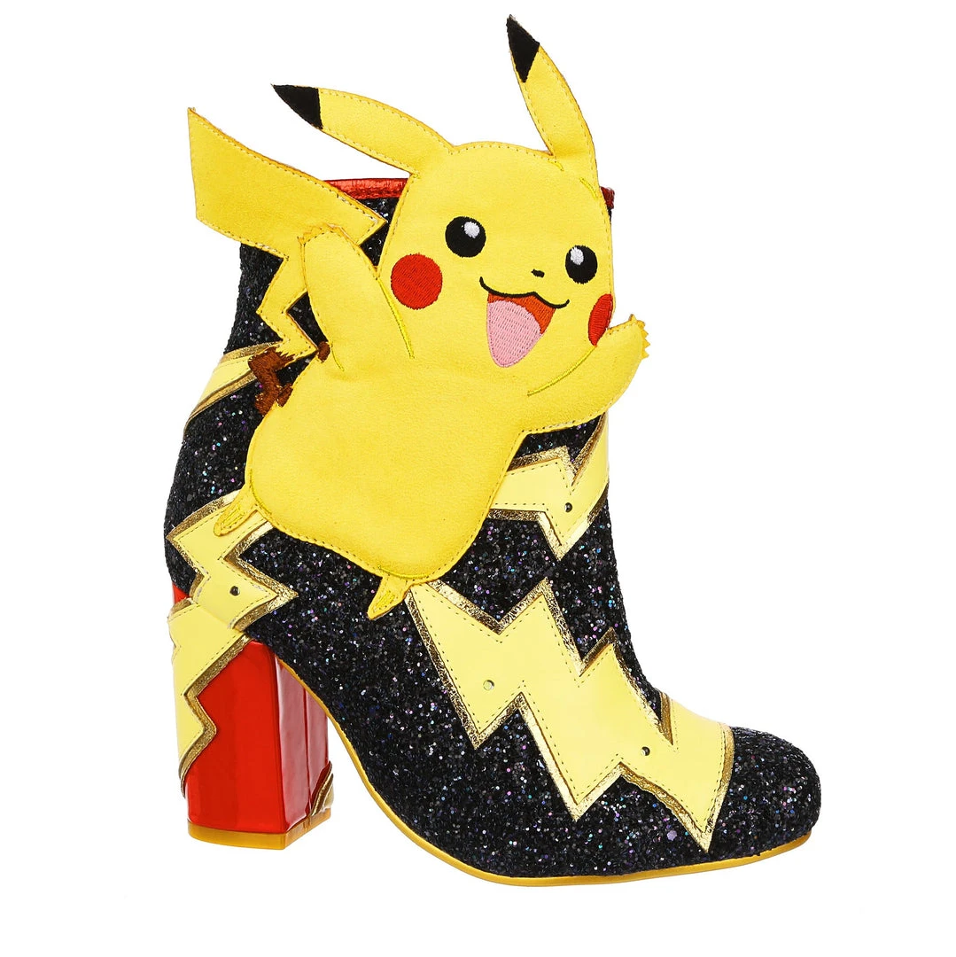Pikachu! I choose you! These are the ULTIMATE Pikachu boots! Shimmering black glitter is topped with graphic lightning bolts that are dotted with flashing lights, and at the centre is a beautiful applique of Pikachu jumping! The chunky heel is a striking patent red to really make these a pair of boots to remember!