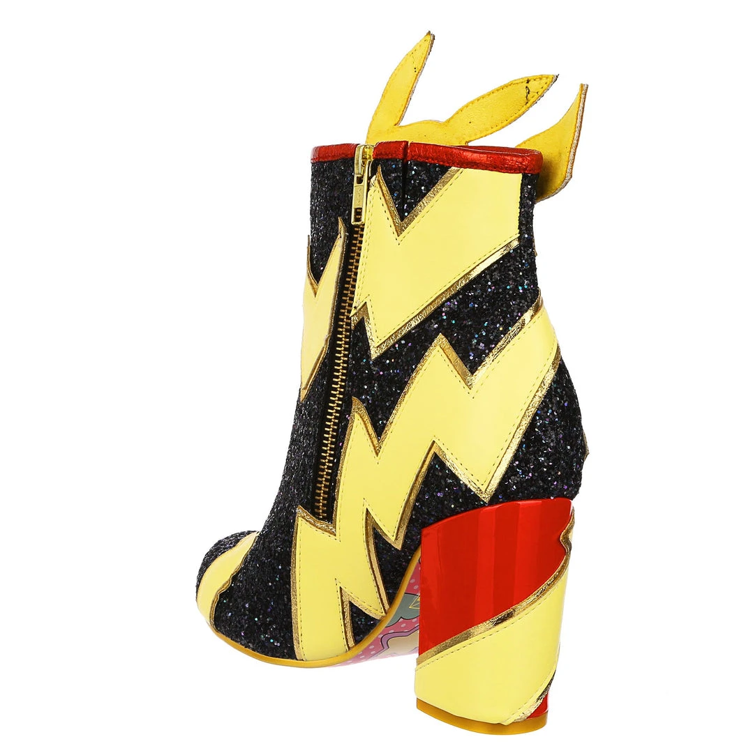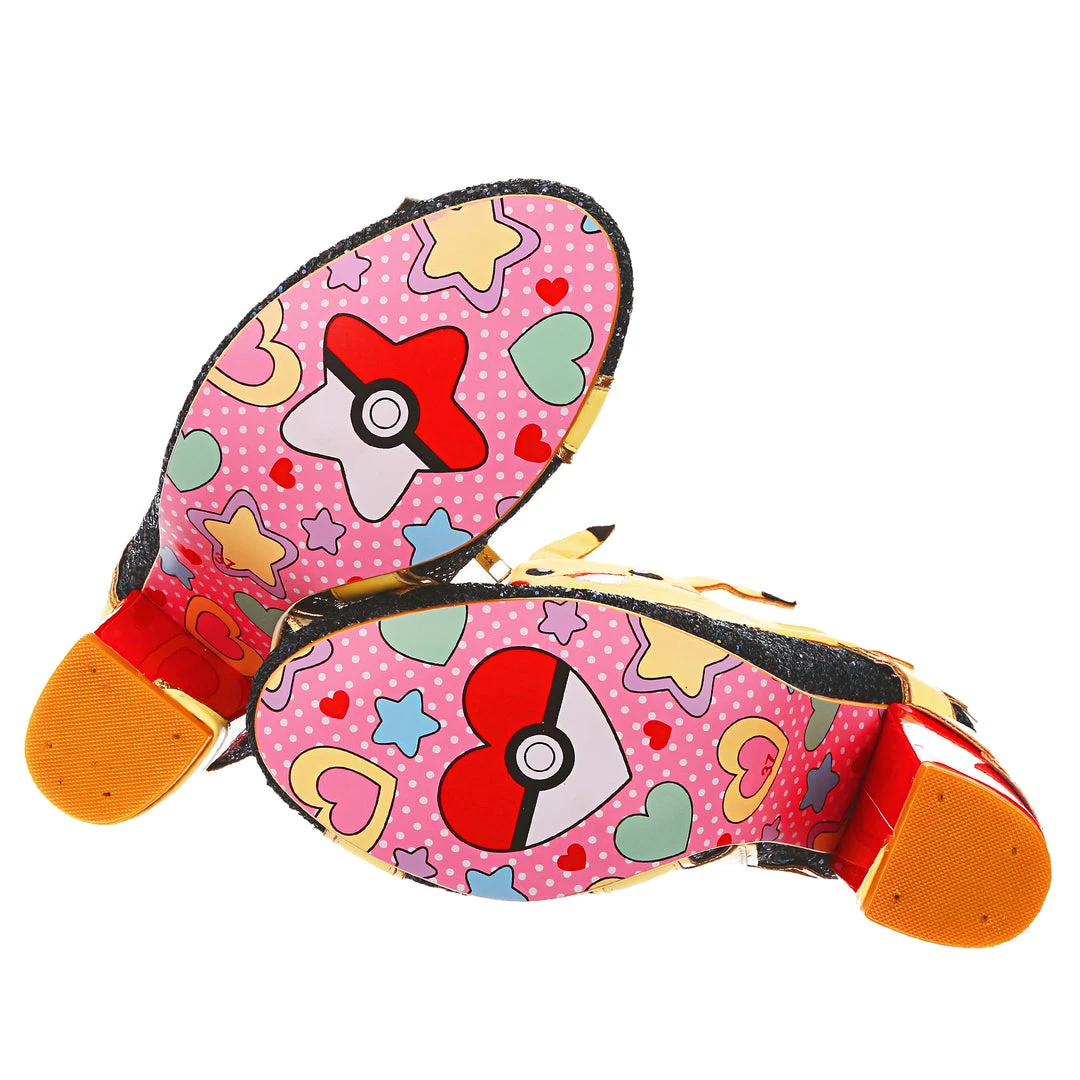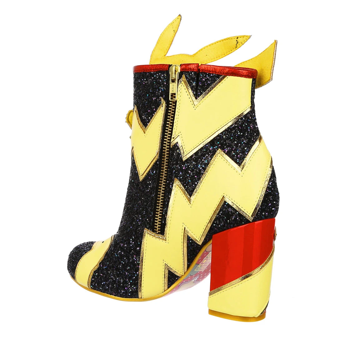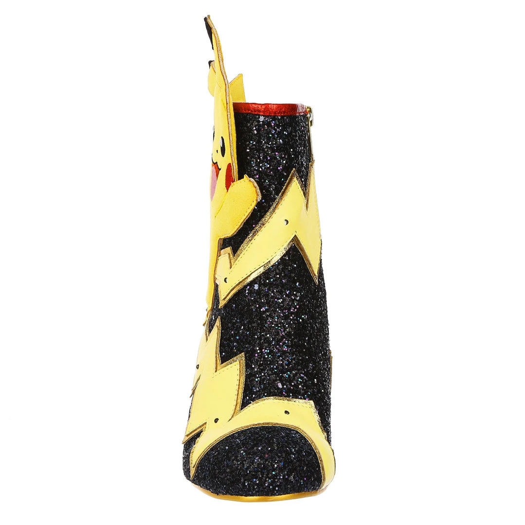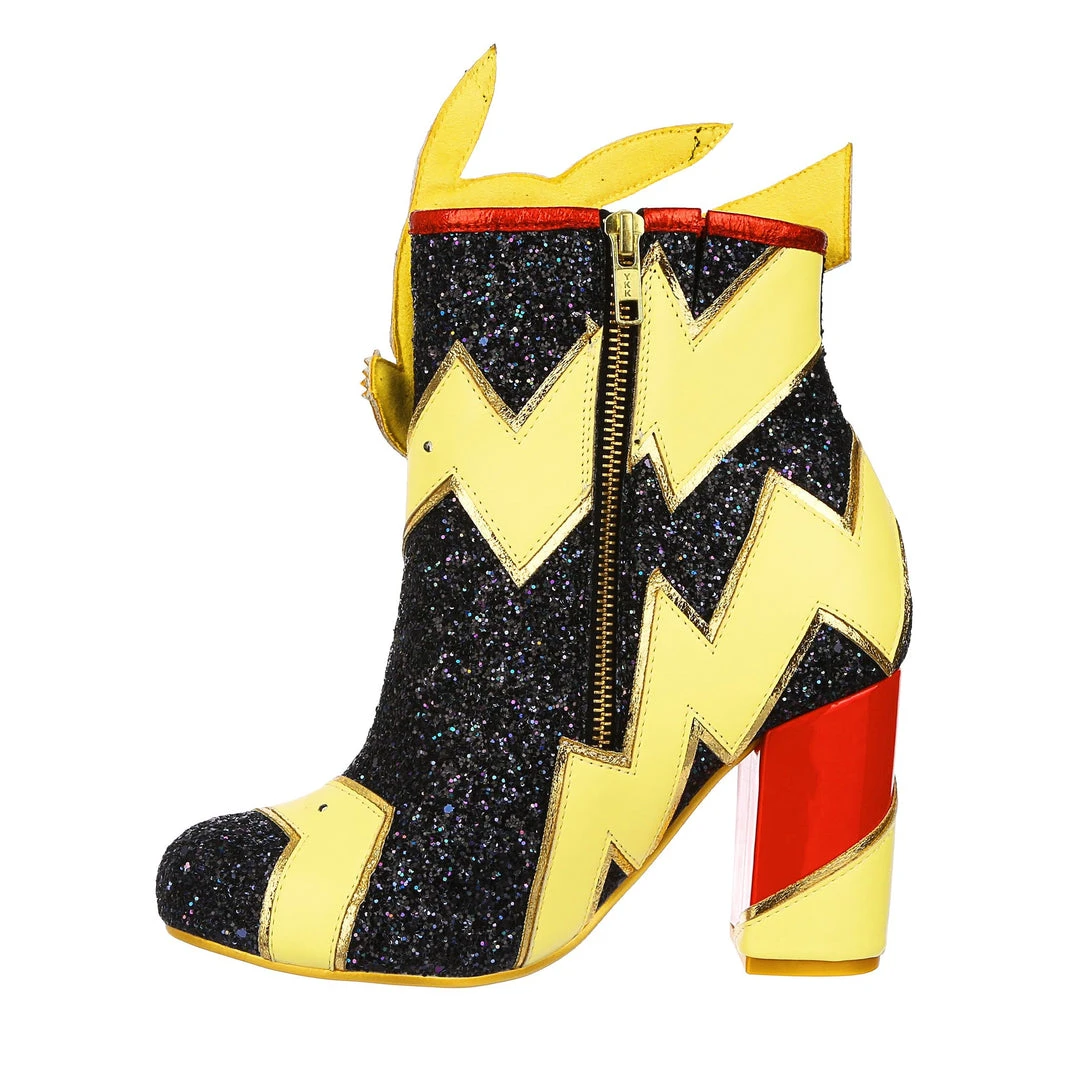 Pikachu! I choose you! These are the ULTIMATE Pikachu boots! Shimmering black glitter is topped with graphic lightning bolts that are dotted with flashing lights, and at the centre is a beautiful applique of Pikachu jumping! The chunky heel is a striking patent red to really make these a pair of boots to remember!