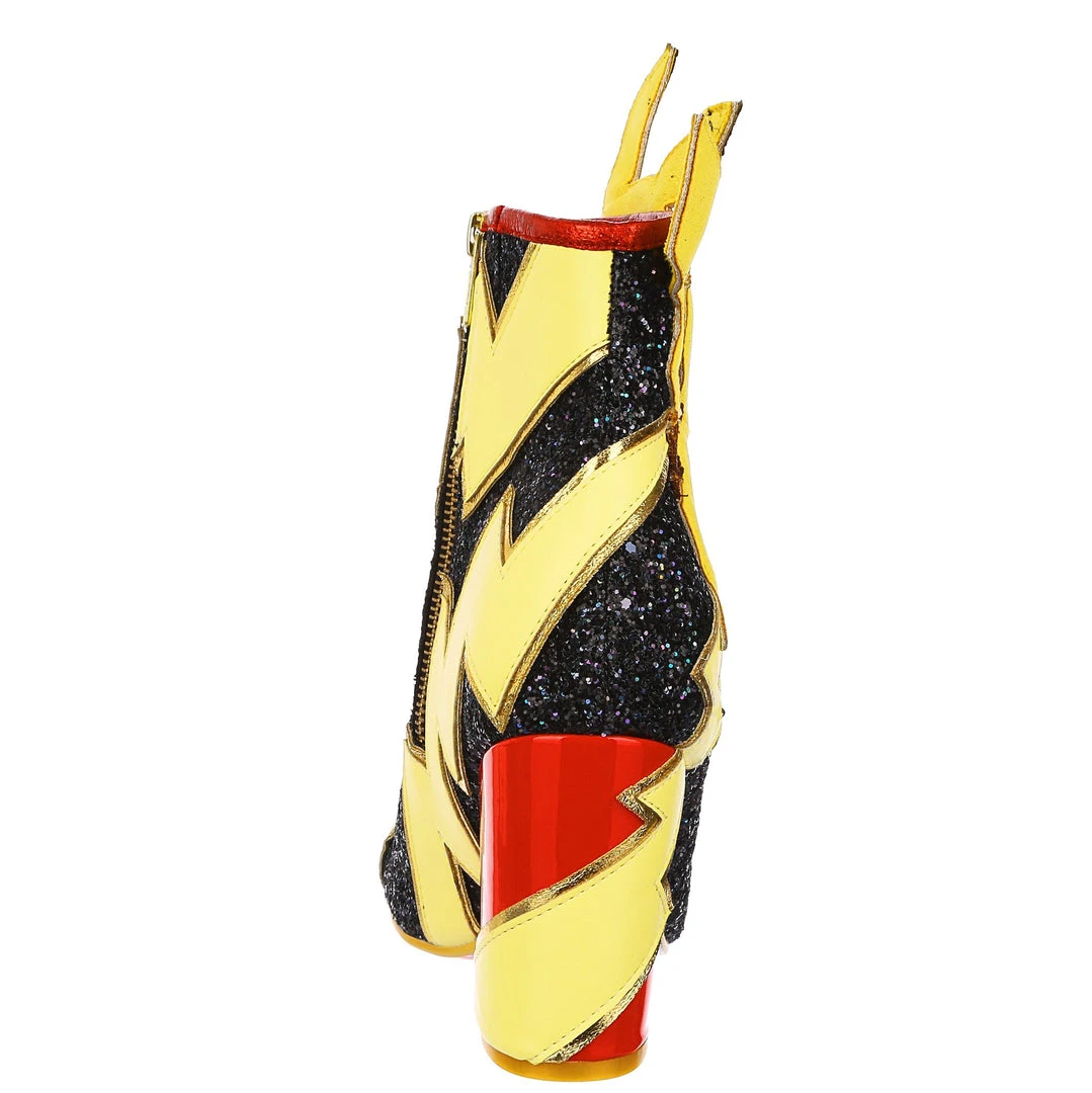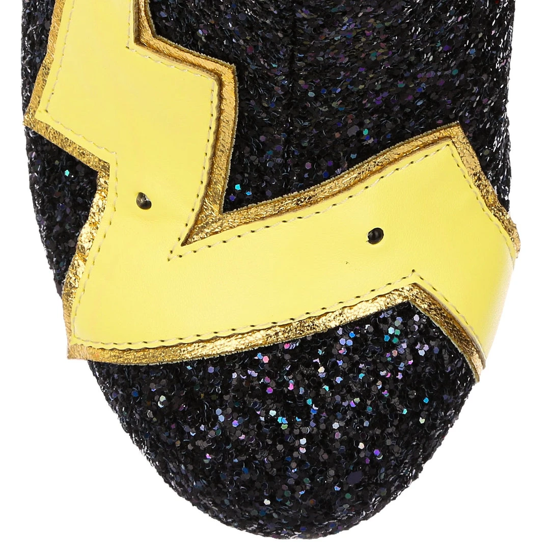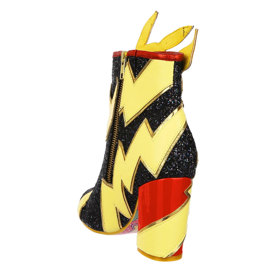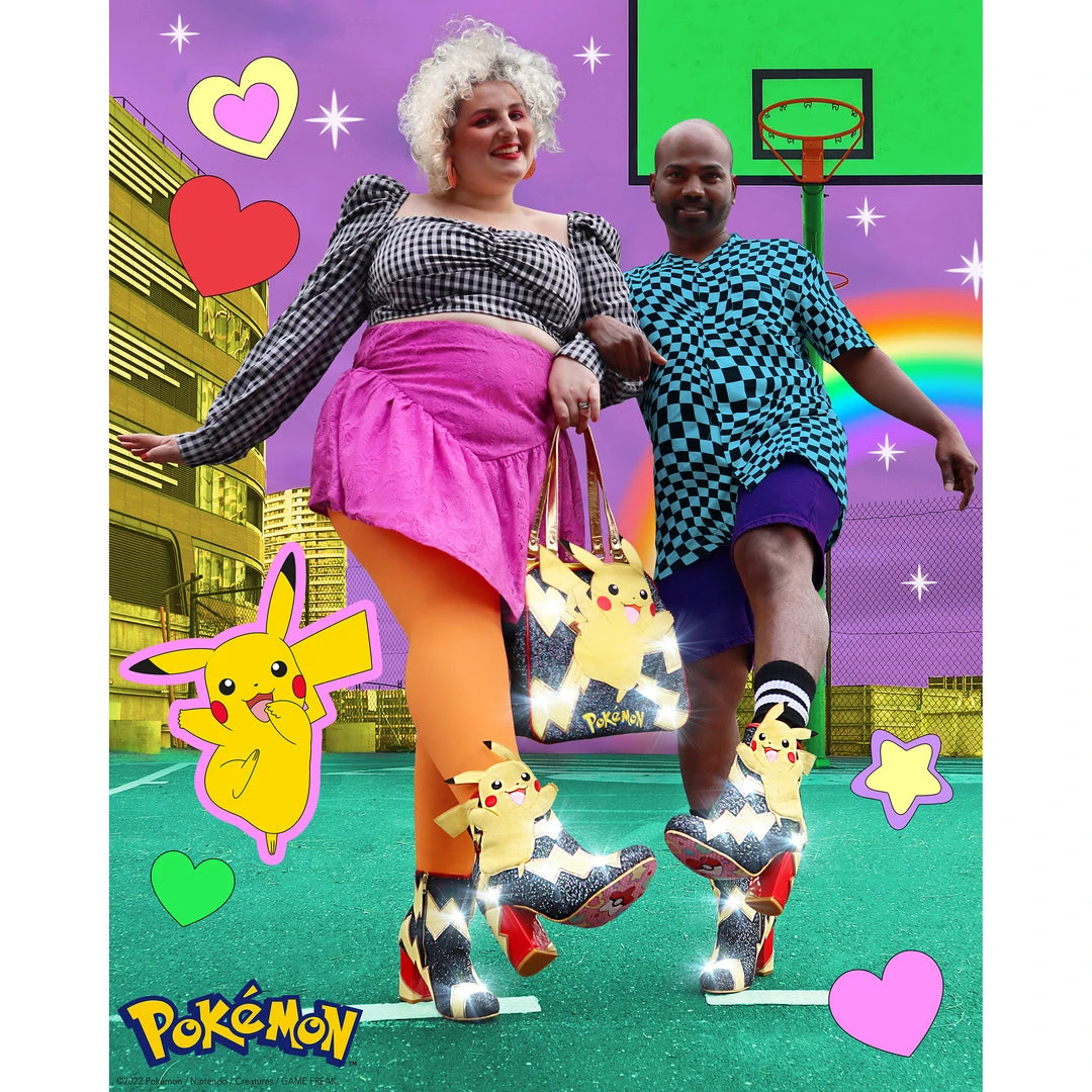 Pikachu! I choose you! These are the ULTIMATE Pikachu boots! Shimmering black glitter is topped with graphic lightning bolts that are dotted with flashing lights, and at the centre is a beautiful applique of Pikachu jumping! The chunky heel is a striking patent red to really make these a pair of boots to remember!