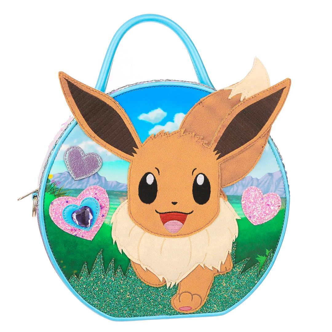 Lets go on an adventure! This adorable bag features the magical Eevee running through a field with blue skies behind them! Surrounded by blue and purple hearts, with Eevee’s ears and tail poking out the edges of the bag to give a 3D effect, this bag is sure to make you feel all warm and fuzzy whenever you glance over! A statement round shape is topped with a handle for ease of carrying, but also comes with an adjustable shoulder strap too! Perfect for any would-be adventurer on the go! Featuring a reverse print of Eevee, Pikachu, Squirtle, Vaporeon, Gyarados, & Magikarp.