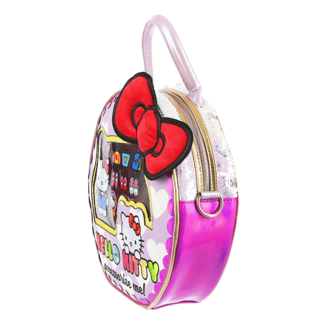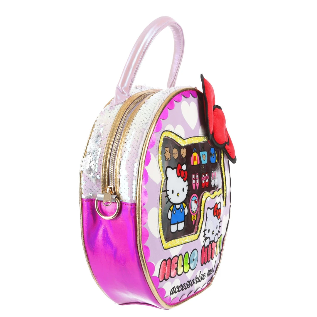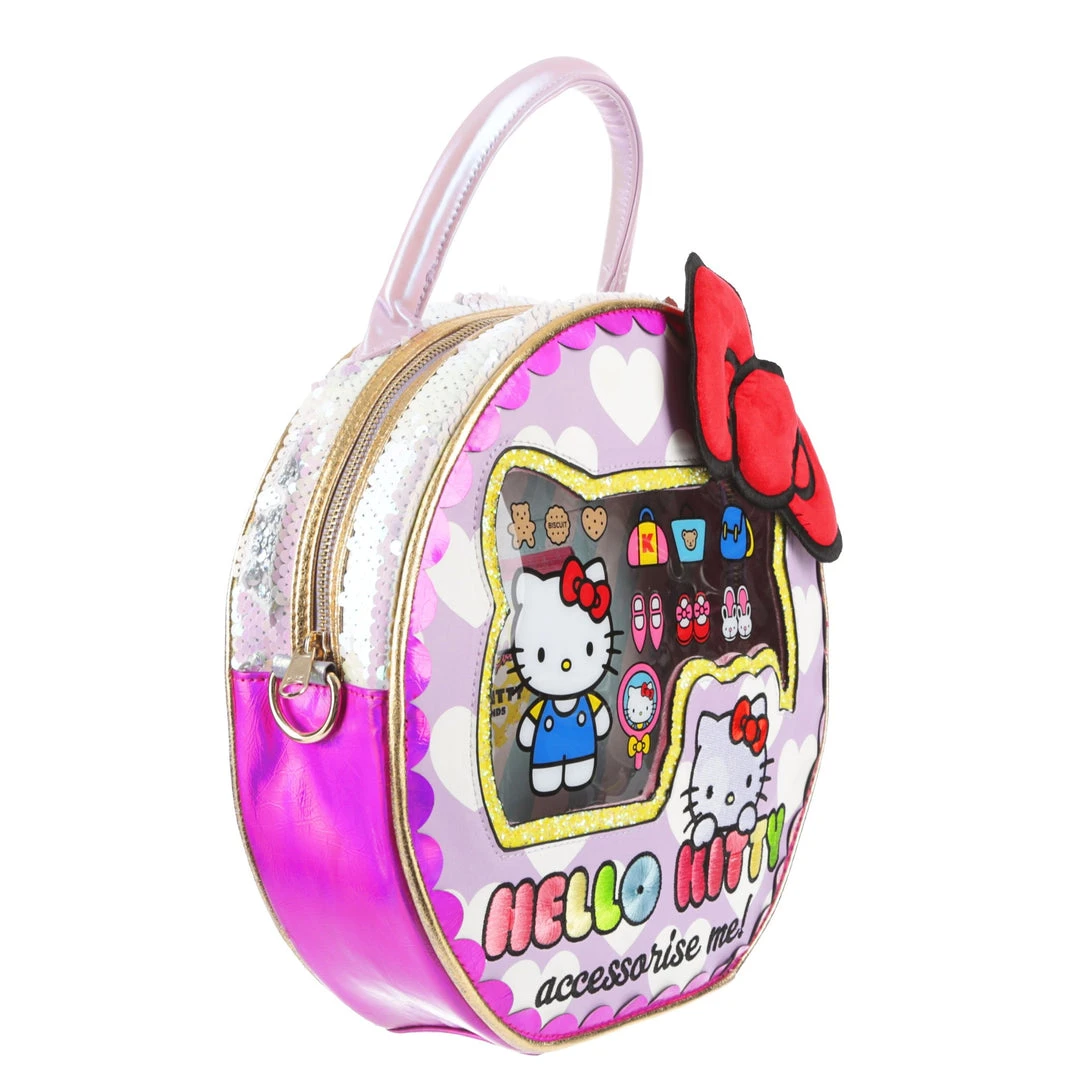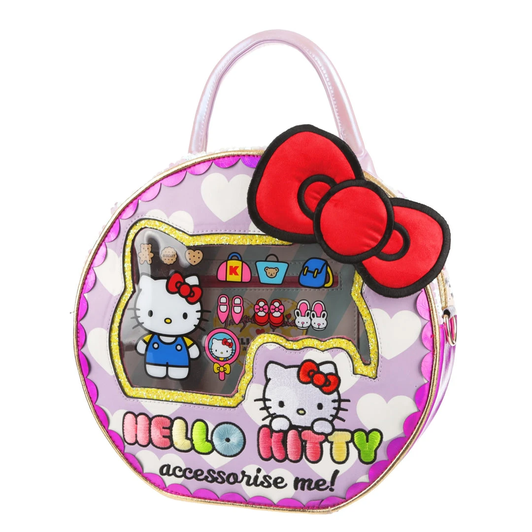 Take your style on the go with this adorable bag! Styled to look like a Hello Kitty toy package with a clear window and shimmering fabrics! The striking circular shape make this bag eye catching and fun, the perfect addition of cute to any wardrobe!
