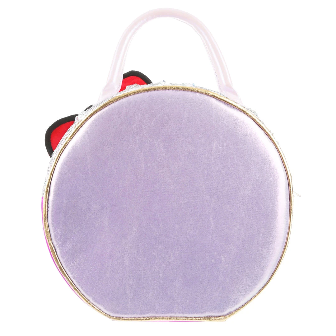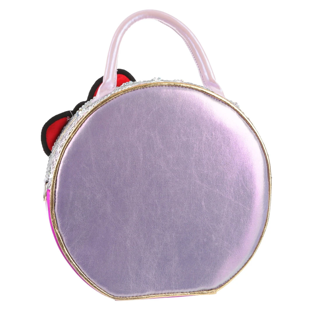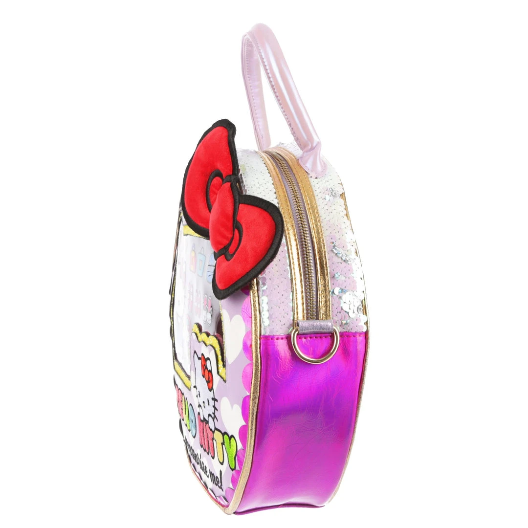 Take your style on the go with this adorable bag! Styled to look like a Hello Kitty toy package with a clear window and shimmering fabrics! The striking circular shape make this bag eye catching and fun, the perfect addition of cute to any wardrobe!