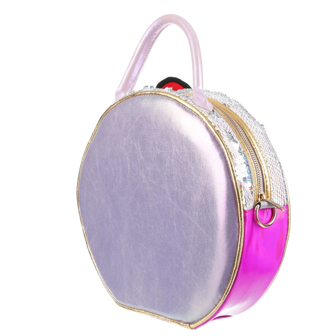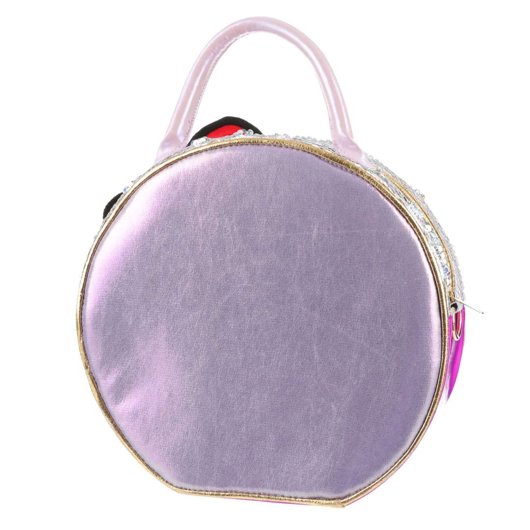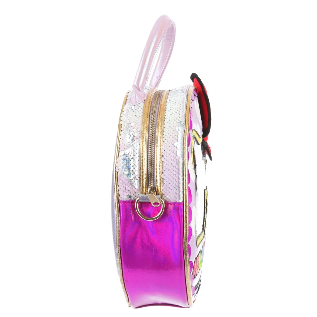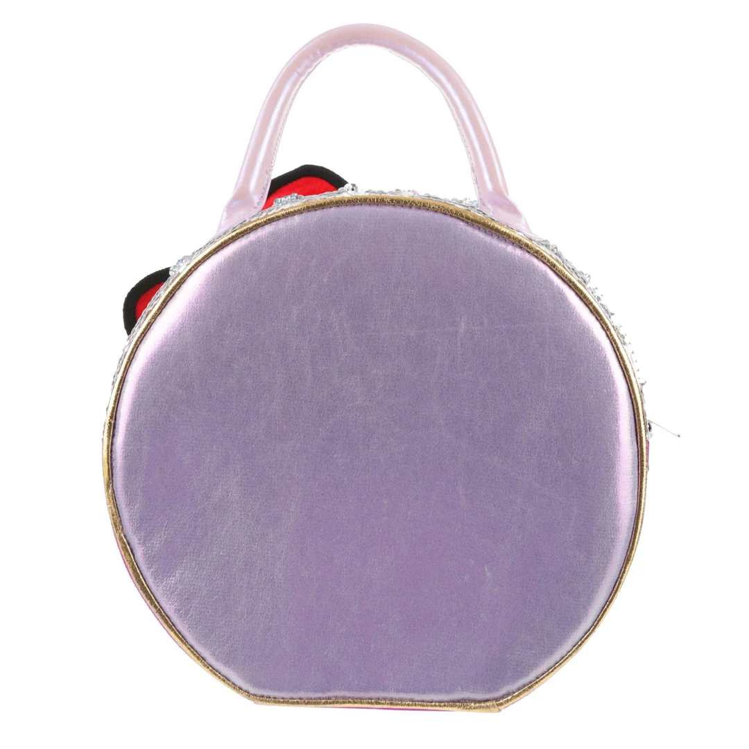 Take your style on the go with this adorable bag! Styled to look like a Hello Kitty toy package with a clear window and shimmering fabrics! The striking circular shape make this bag eye catching and fun, the perfect addition of cute to any wardrobe!