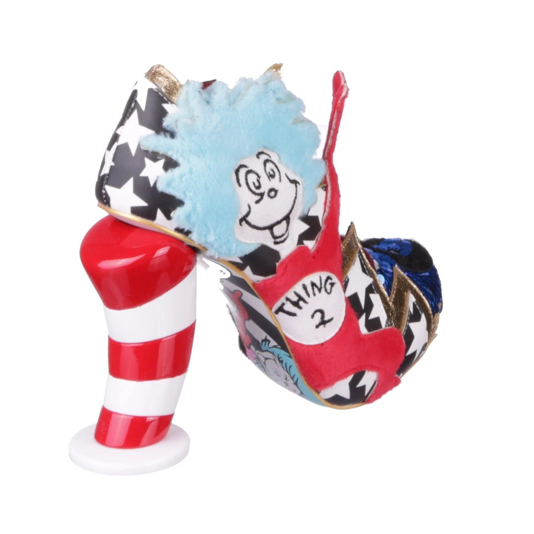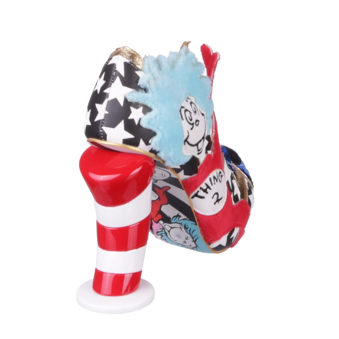 Get mischievous with these cuties! Featuring everyone’s favourite trouble makers – Thing One and Thing Two – and our fun Cat’s Hat character heel, these shoes are a must-have for the Seuss lover looking to make a statement! Dazzling blue sequins are paired striking monochrome stars, gold metallic leather and swirling cat tail detailing, these shoes are a party on your feet! Perfect to wear on their own, or match with our coordinating bag for the ultimate Dr Seuss look – guaranteed to bring a boost of fun and games to any outfit!
